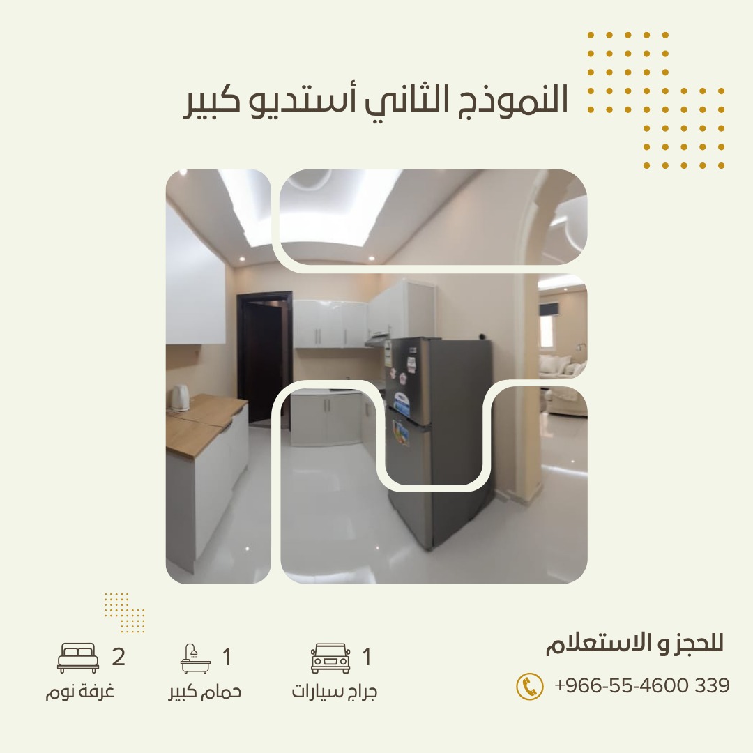 استديو خاص كبير تقسيم الوحدة / غرفة - حمام - مطبخ مستقل . الأثاث / غرفة نوم كاملة " سرير ودولاب وتسريحة وكمودينة"، مكتب، كرسي دراسة، صوفا، طاولة قهوة...